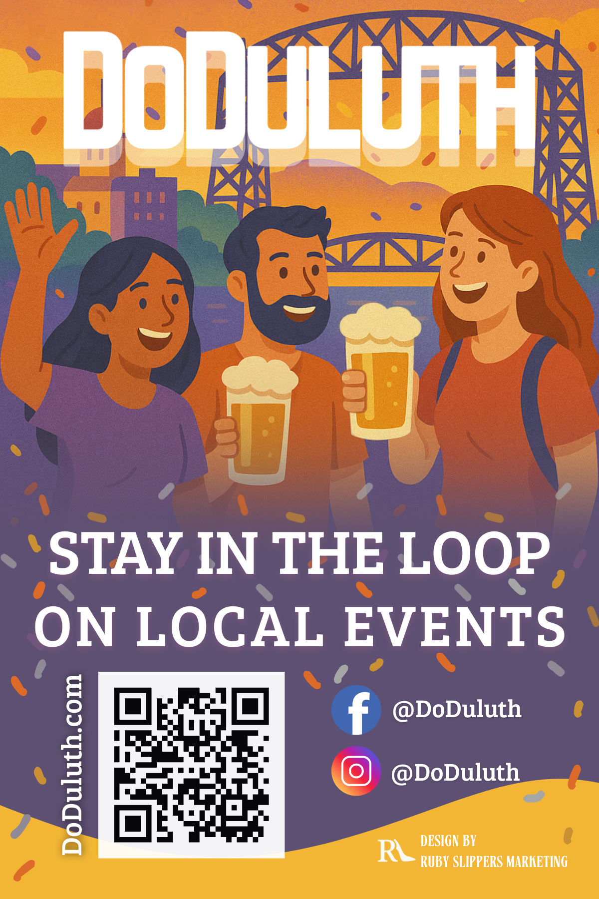 This bold, colorful front design blends Duluth’s most iconic landmark, the Aerial Lift Bridge. With a cheerful crowd enjoying beers, backpacks, and good vibes. The scene captures the spirit of the city while encouraging locals and visitors to scan the QR code and stay in the loop on upcoming events. Social handles and branding are seamlessly integrated for a polished, eye-catching finish.